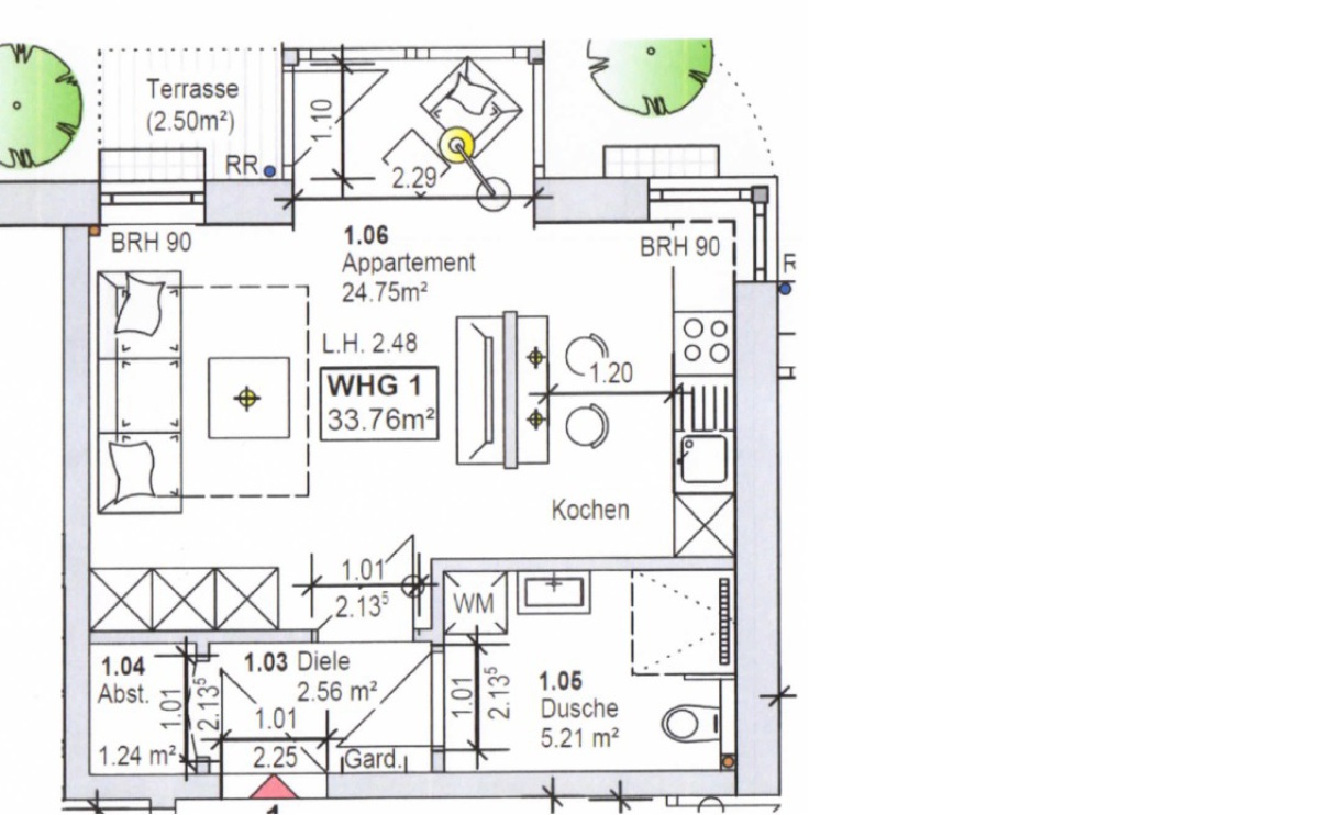 1 Zimmer Appartement 33,76 qm Terrasse 2,50 qm plus Loggia Senioren gerecht KFW 70 Energiesparhaus Einbauküche Bad mit Dusche ebenerdig Fußbodenheizung